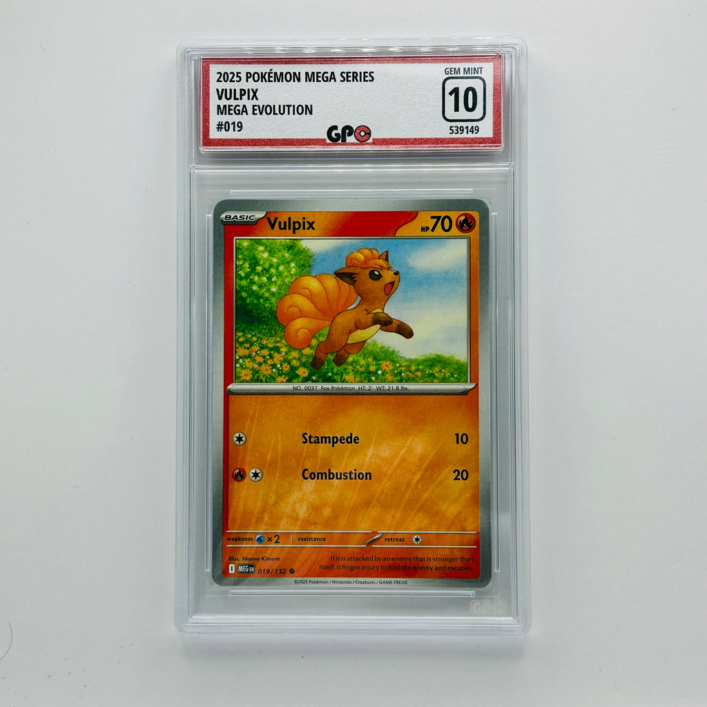 GPC 10 Vulpix #019 | 2025 Mega Evolution Series | Mega Evolution Base Set  GRADE 10 - GEM MINT  Serial Number 539149  Centring - Front (10) 50/50 | Back (10) 50/50  Corners - Front (10) | Back (10)  Surface - Front (10) | Back (10)  Edges - Front (10) | Back (10)