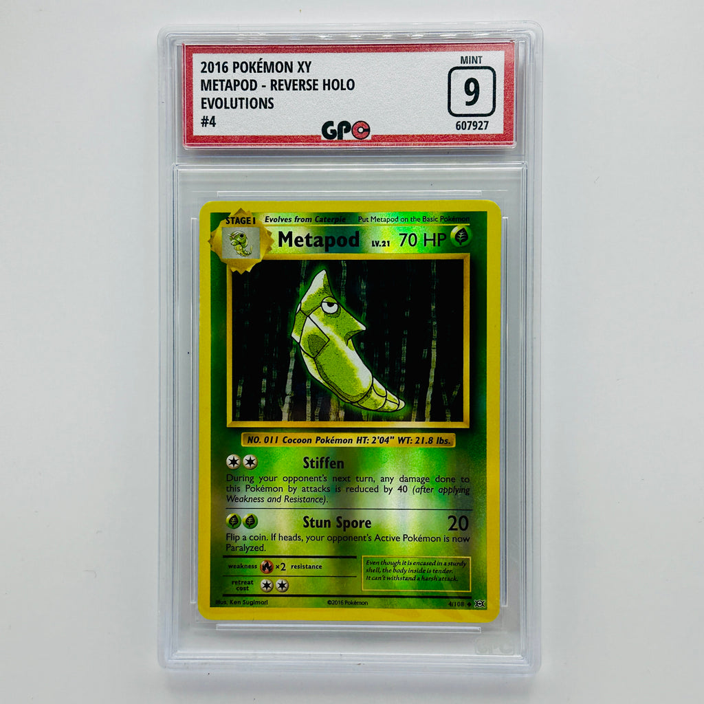 GPC 9 Metapod Reverse Holo #4 | 2016 XY Series | Evolutions Set GRADE 9 - MINT Serial Number 607927 Centring - Front (9) 66/34 | Back (10) 50/50 Corners - Front (9) Slight Darkening Bottom Corners | Back (10) Surface - Front (10) | Back (10) Edges - Front (10) | Back...